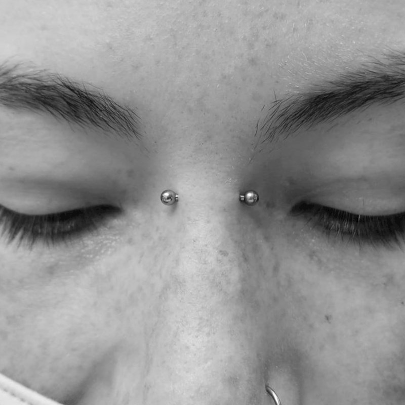 Bridge piercing. Placeret ved toppen af næse rykken. Ønsker du at bestille tid til et smykkeskift skal du vælge denne service i bunden.